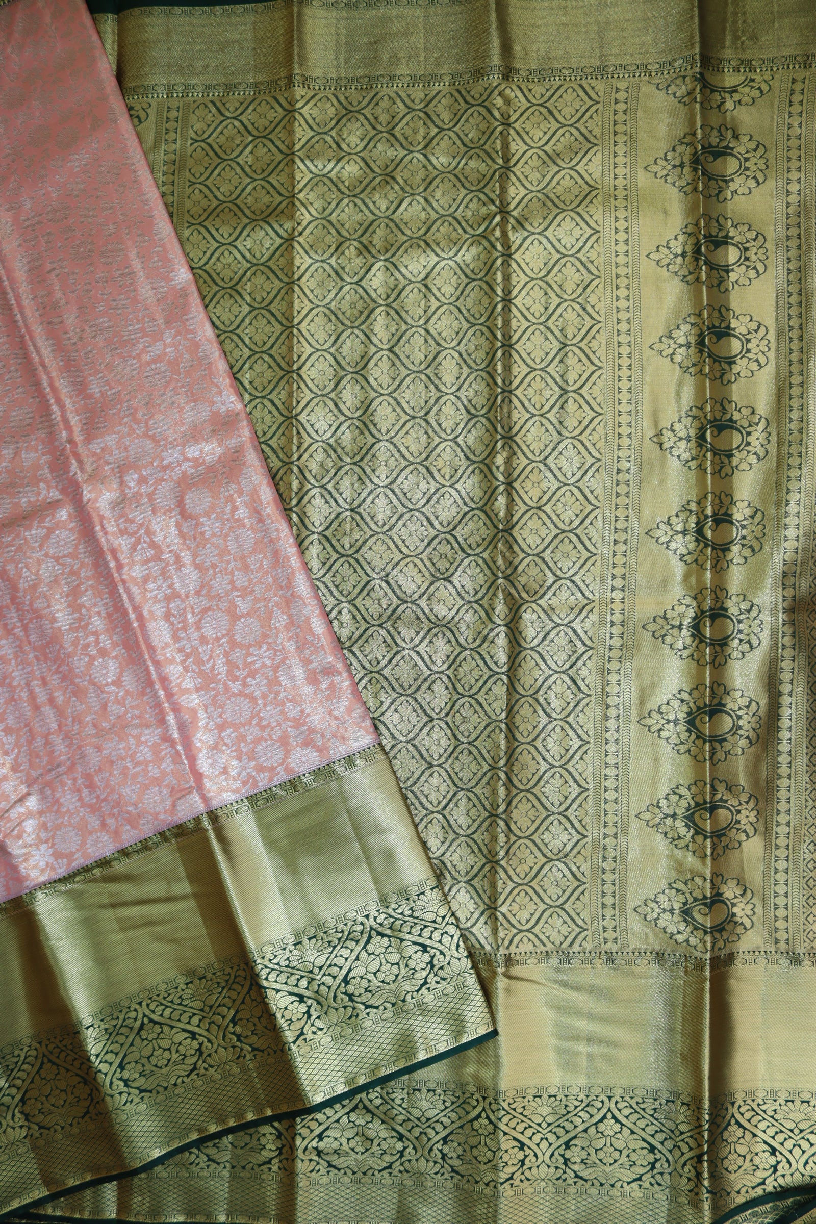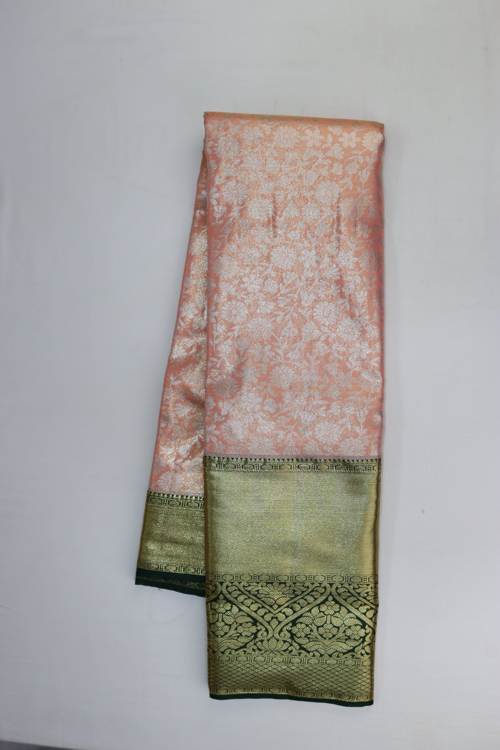 Experience unparalleled elegance with our luxurious Classic Coral Pink Kanjipuram Saree. Combining traditional and modern elements, this saree features exquisite detailing in a rich coral pink color. Elevate your style and make a statement at any event. Embrace the sophistication of the Royal Pink Kanjipuram Saree.