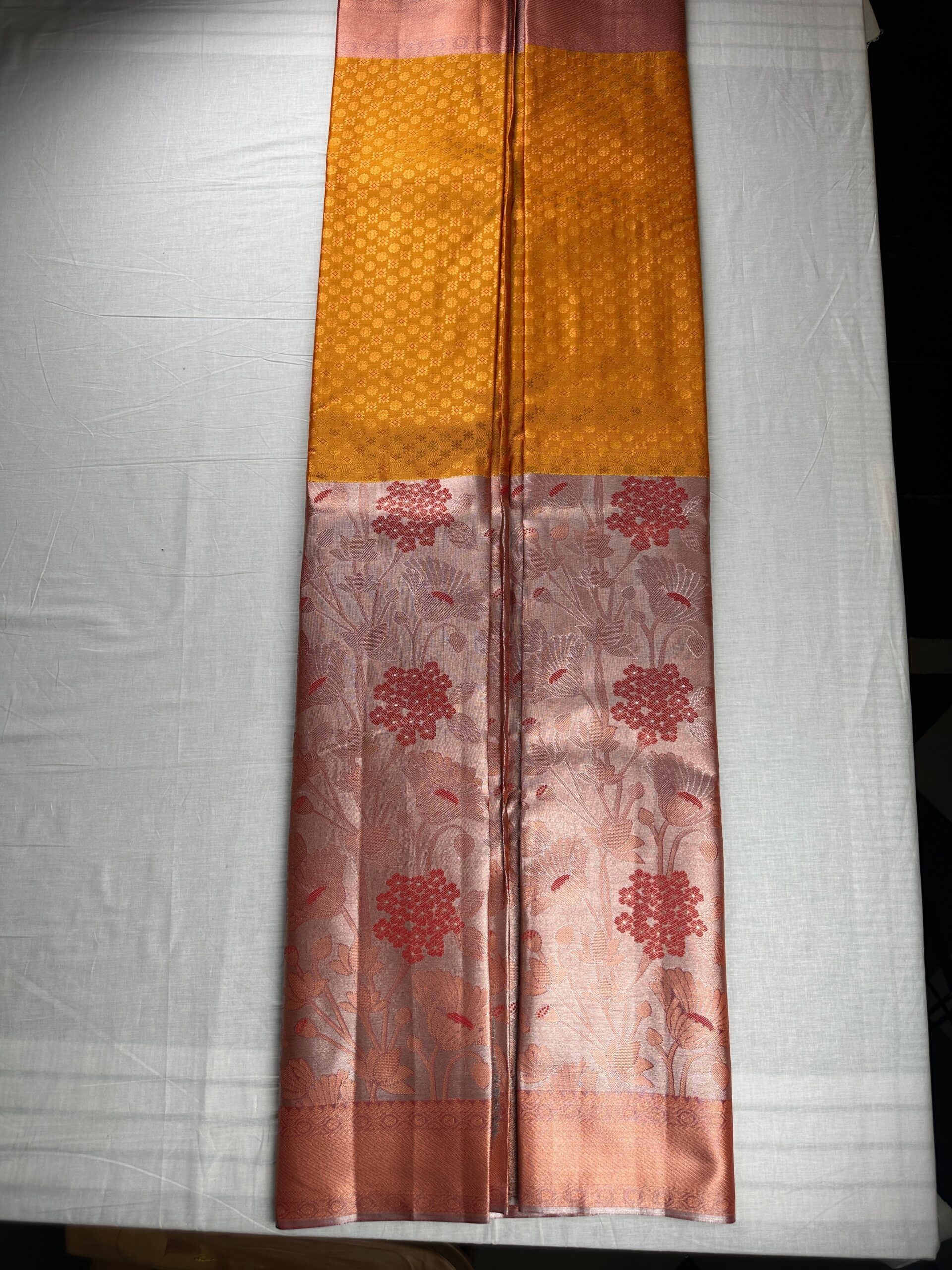Present an alluring look with this exquisite Classy Apricot Orange Kanjipuram Silk Saree. The silk fabric ensures durability and a gorgeous drape, perfect for making heads turn. Add a touch of elegance to any occasion with this beautiful saree.