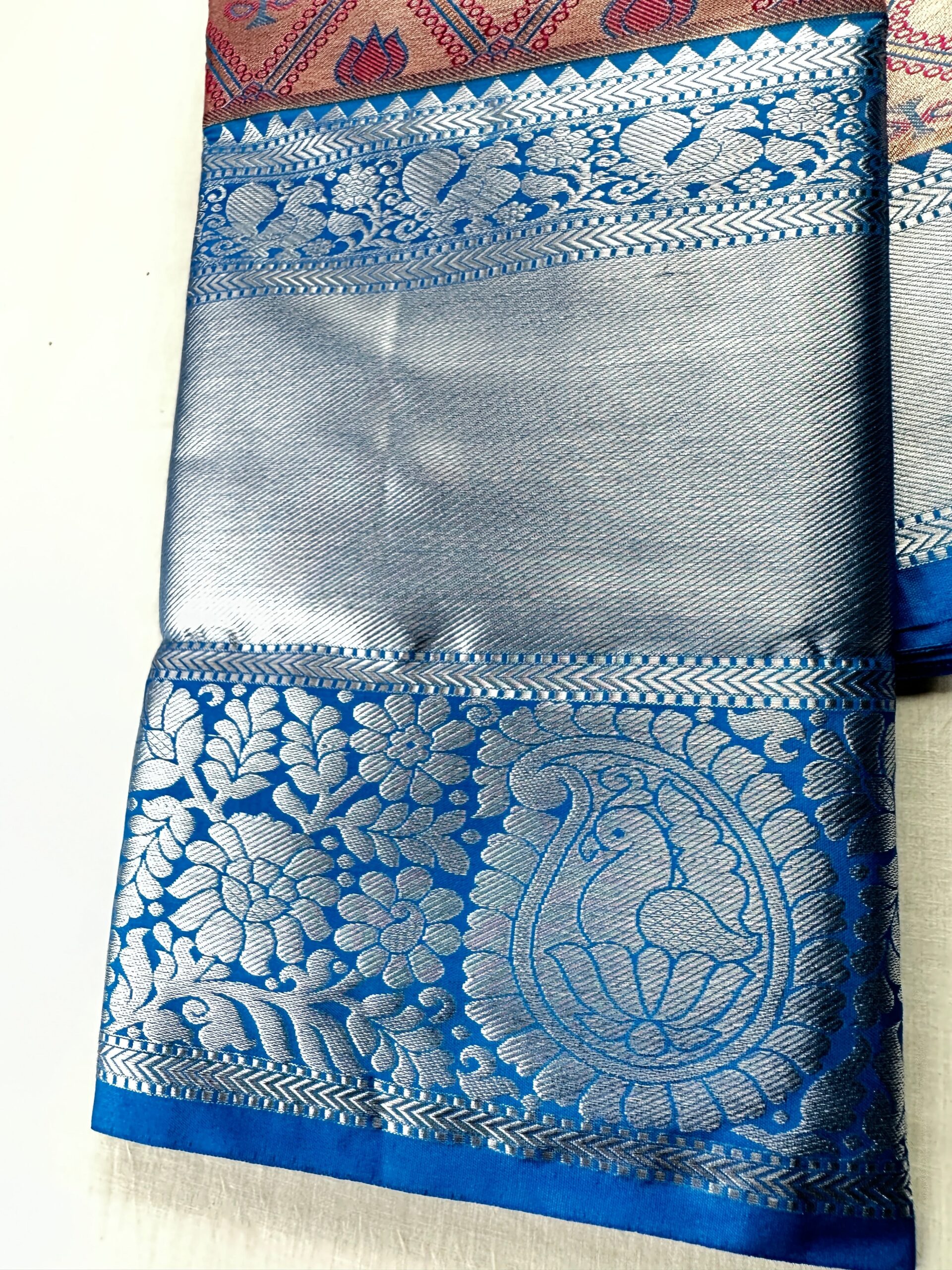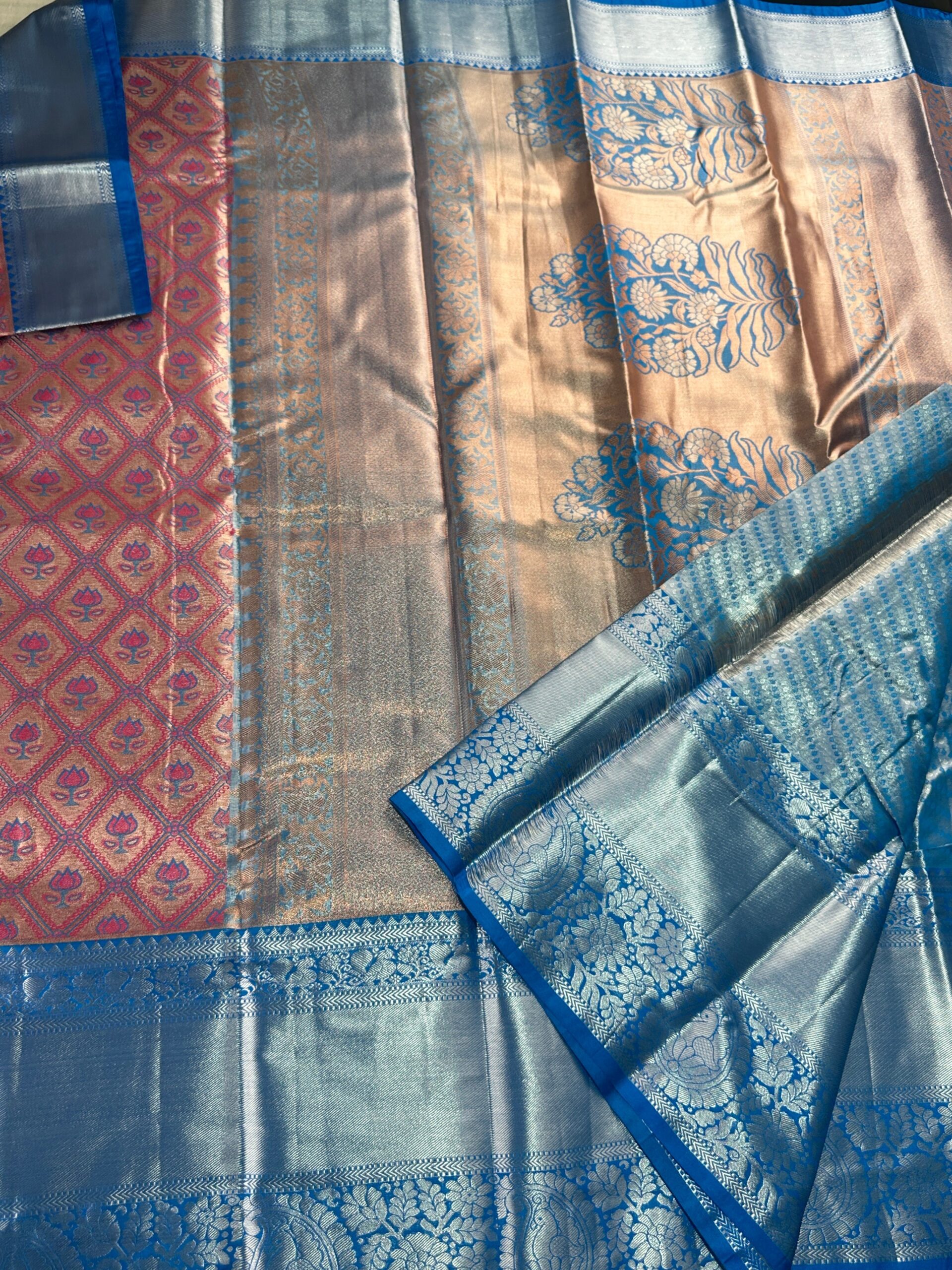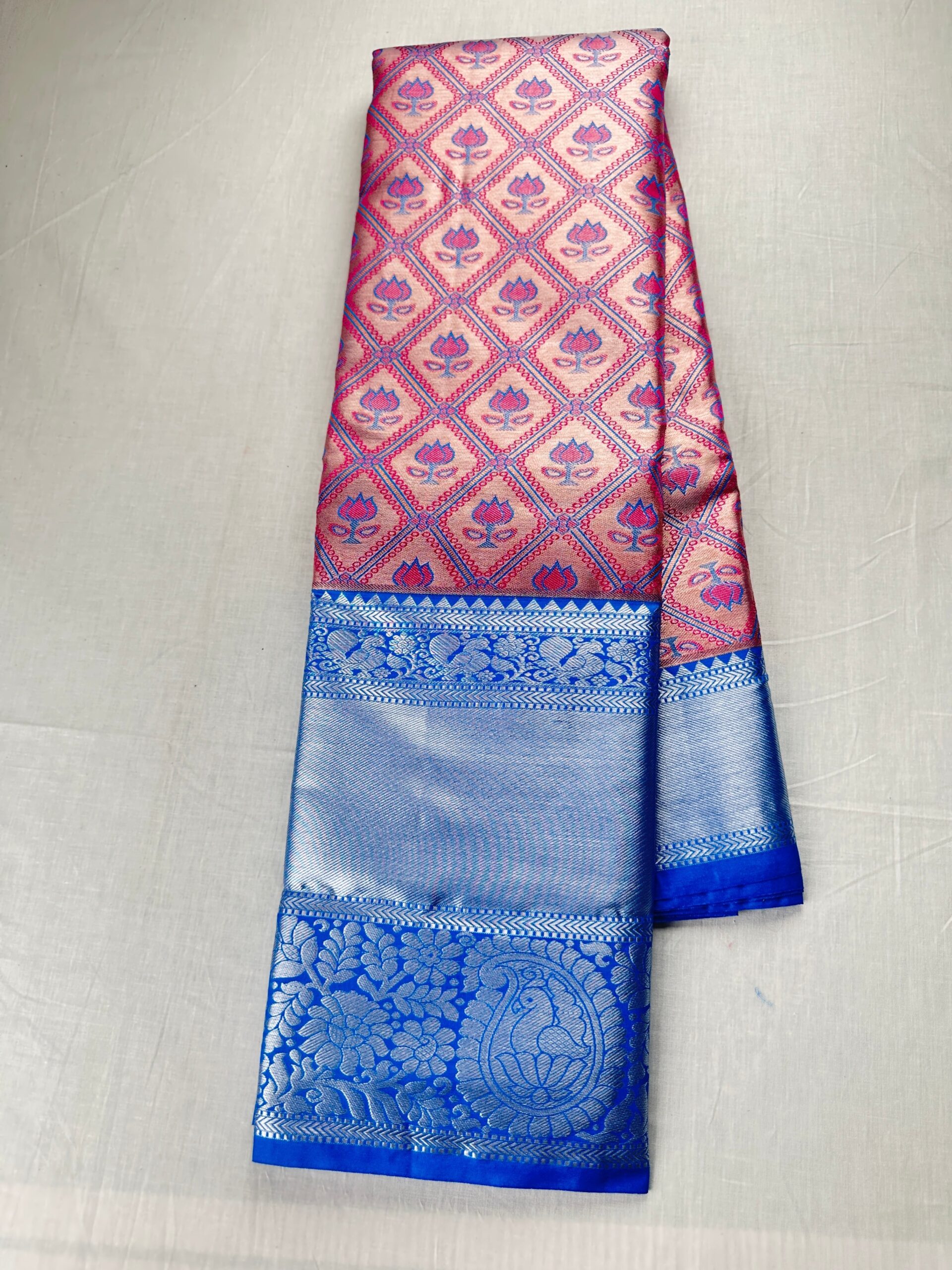 This Exotic Baby Pink Kanjipuram Silk Saree is crafted with silk for a luxurious feel. This saree is designed to dazzle, making it perfect for special occasions. With the rich texture and delicate embroidery, this saree is sure to turn heads.