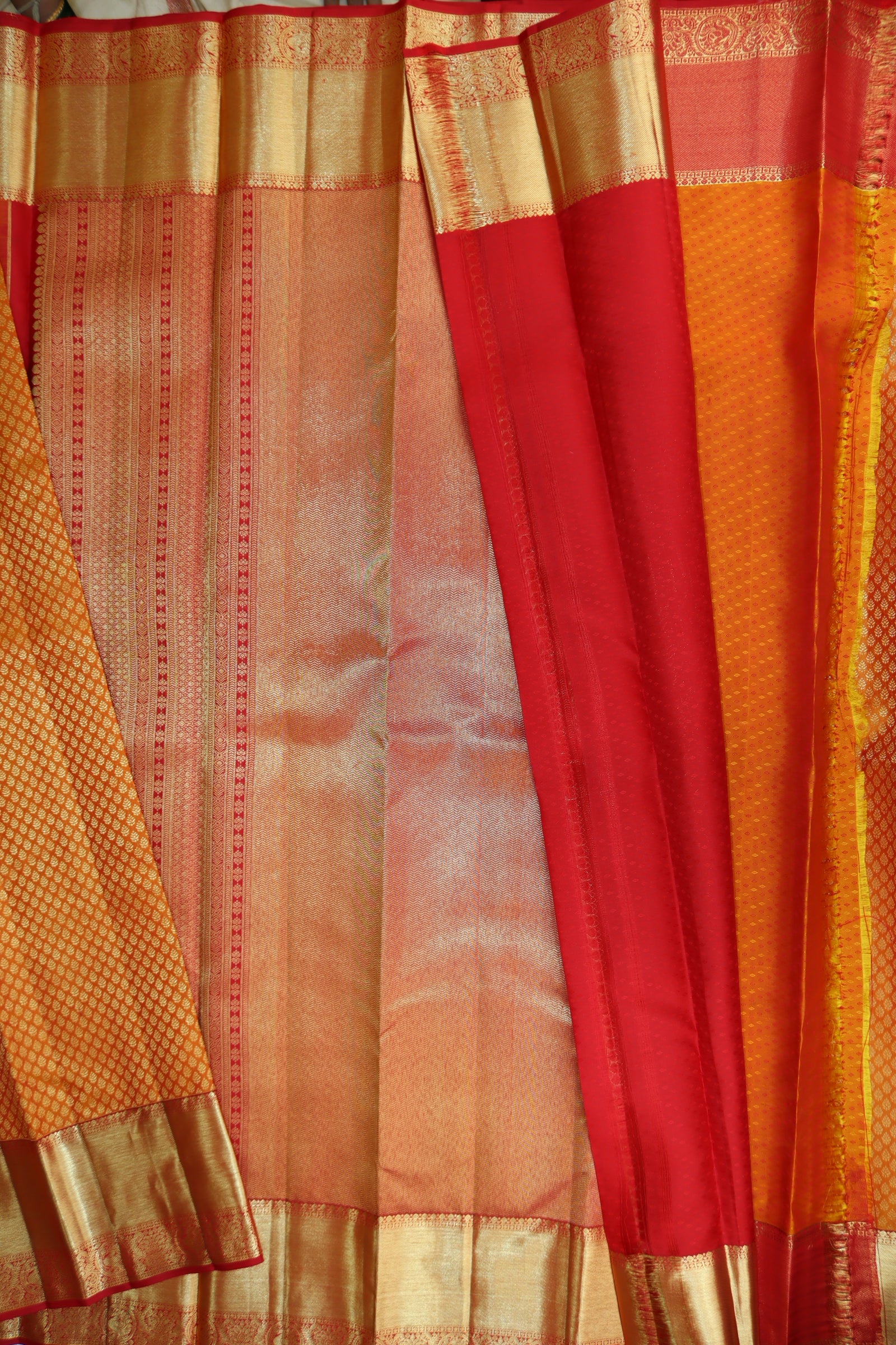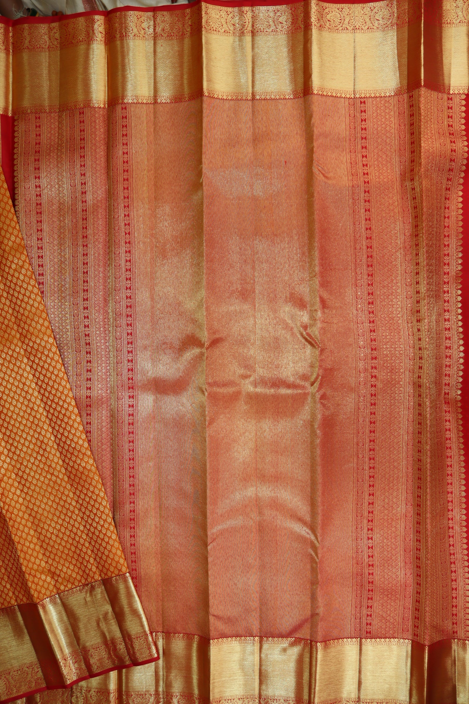 Enhance your fashion with our Gorgeous Orange Kanjipuram Saree. Made with high-quality materials, it seamlessly blends elegance and convenience. Its lightweight design and luxurious texture make it perfect for any occasion. Includes a blouse for versatility. Place your order now and elevate your style game.