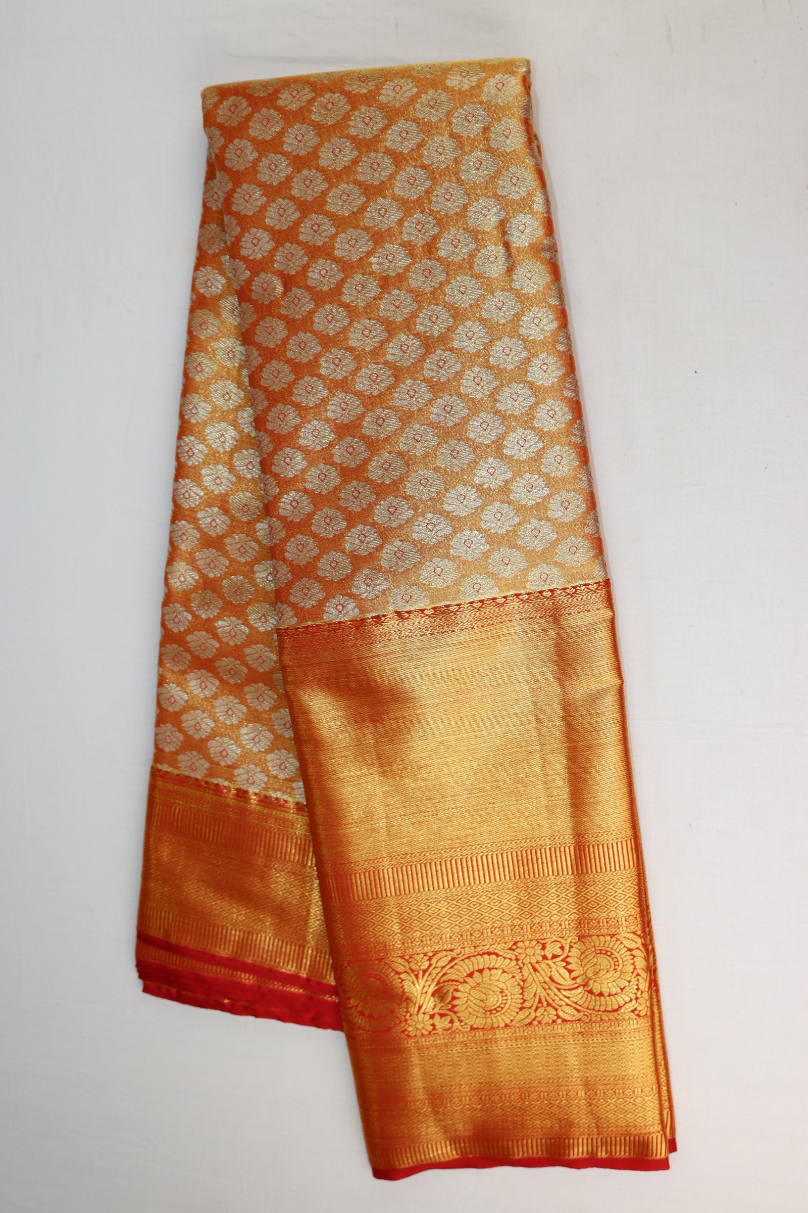 Experience sophistication and versatility in our Regal Orange Kanjipuram Saree. Meticulously crafted by industry experts with premium materials, this saree guarantees lightweight comfort. Ideal for any event, it includes a coordinated blouse for an elegant appearance.