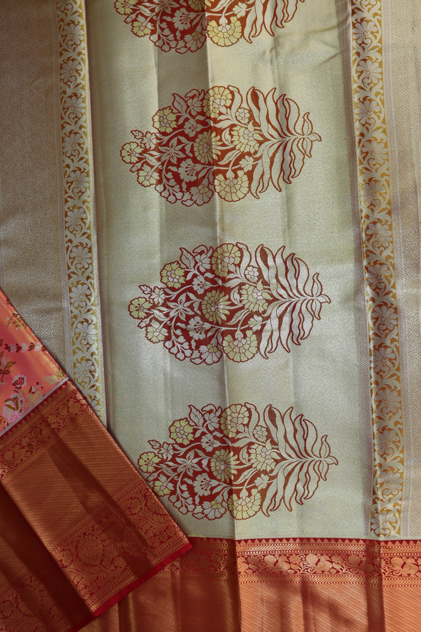 Expertly crafted from sumptuous silk, the Regal Peach Kanjipuram Saree is a must-have for those in search of ultimate elegance. With a refined design and matching blouse, this saree exudes both grace and comfort, making it the perfect choice for any occasion. Elevate your style with our unparalleled Kanjipuram Saree.