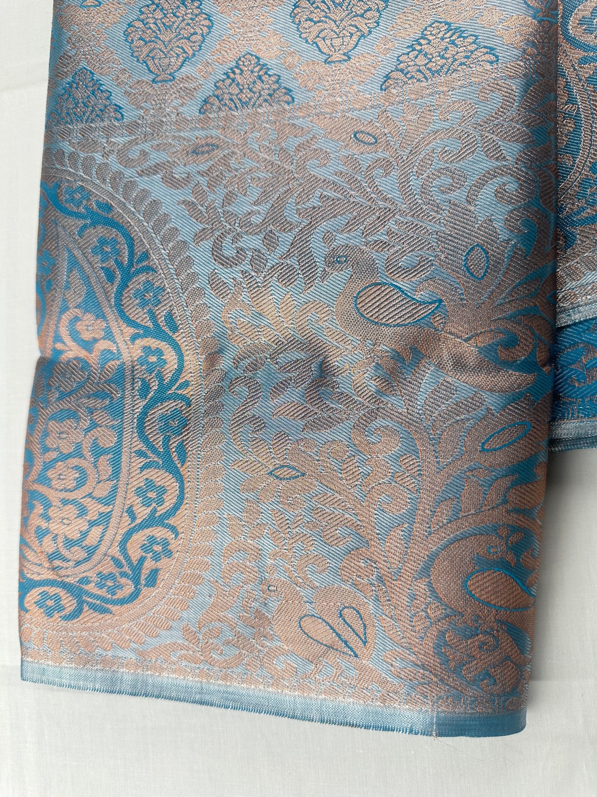 This Rich Blue Kanjipuram Silk Saree is a luxurious and timeless piece. Crafted from pure silk, it boasts an elegant sheen that is perfect for formal and special occasions. Experience the beauty of Indian fashion with this exquisite saree.