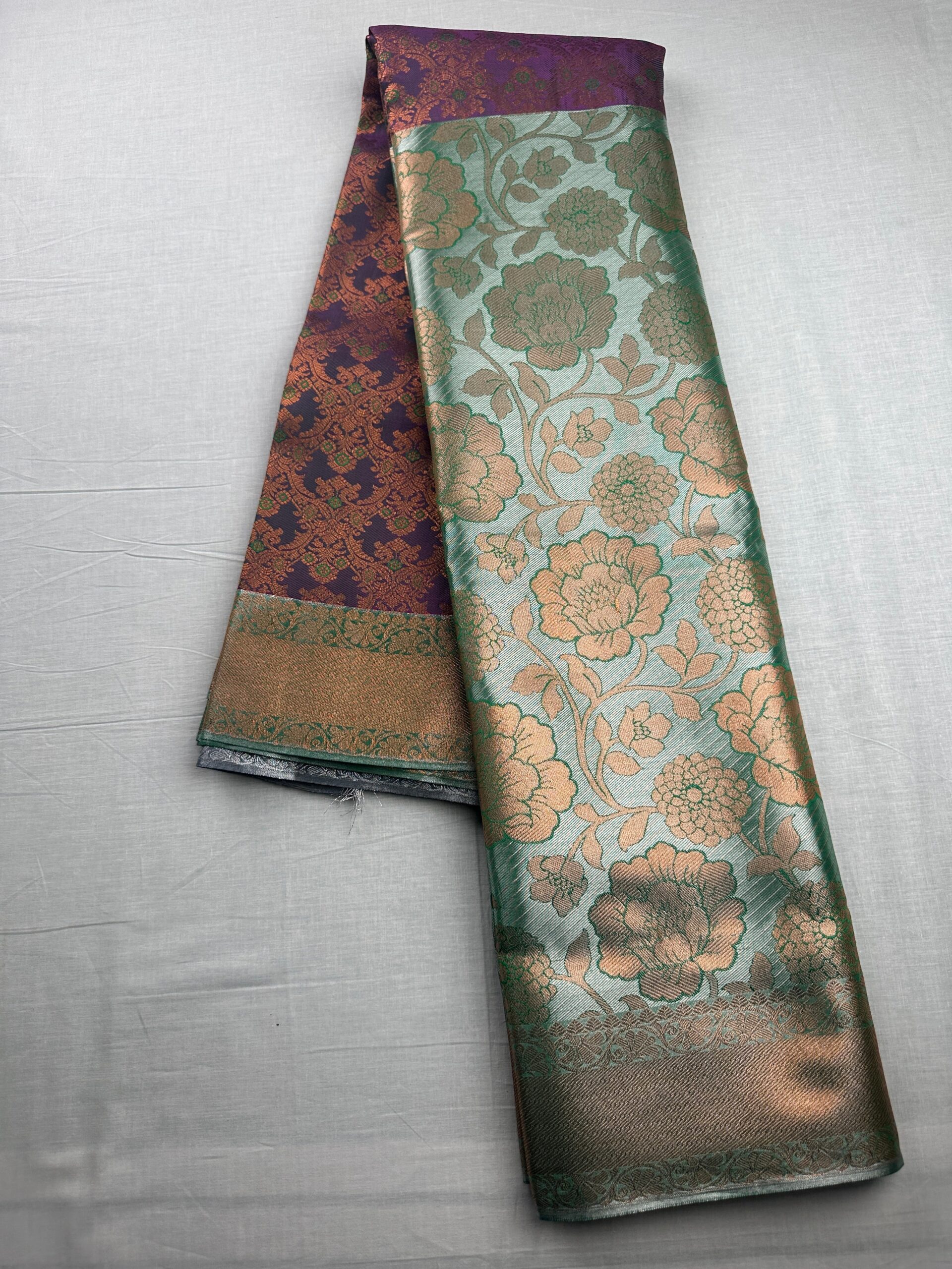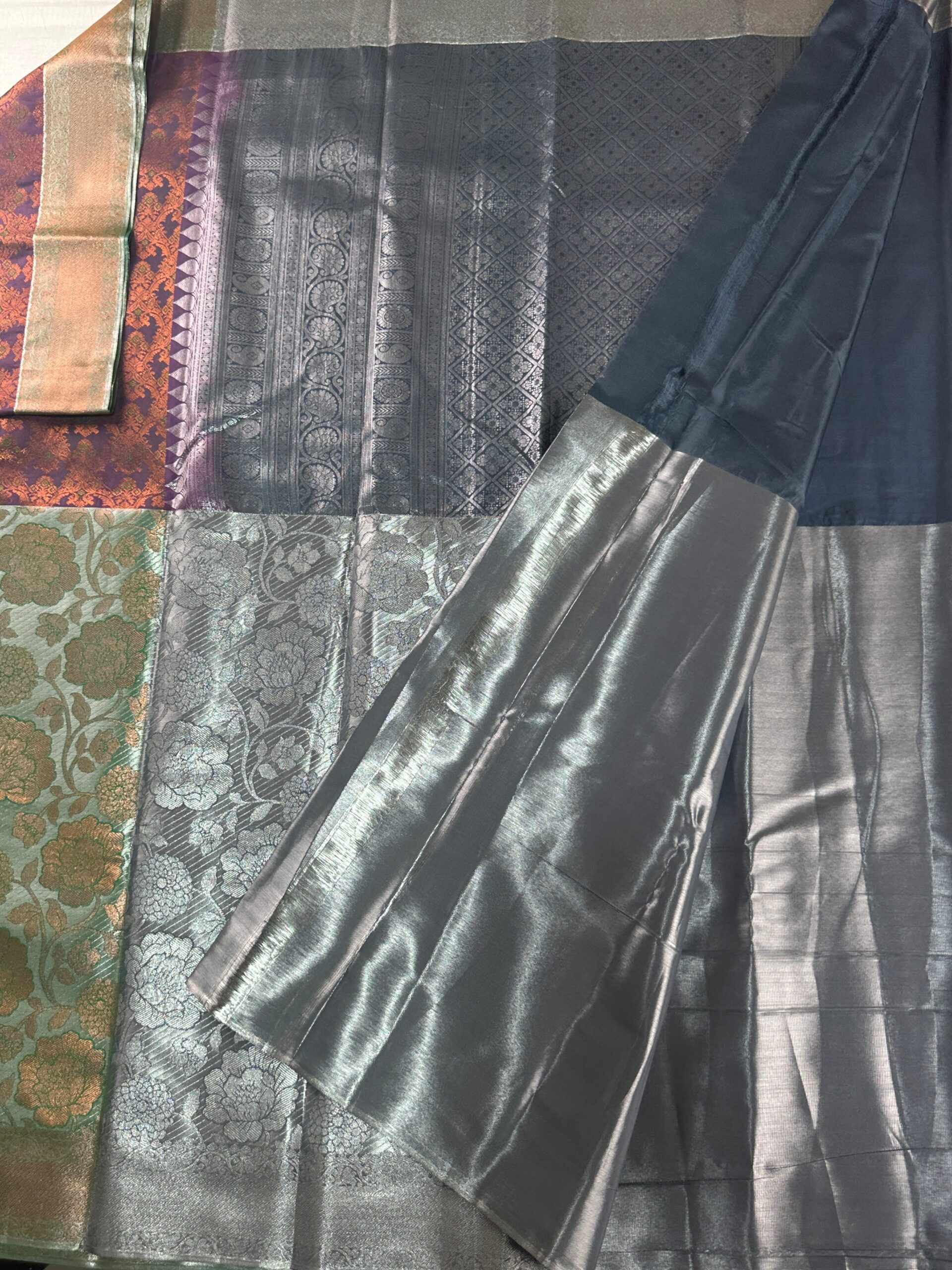 This elegant Rich Green with Navy Blue Kanjipuram Silk Saree features a Half and Half design crafted from silk. It provides striking visual contrast and superb comfort for any special occasion.