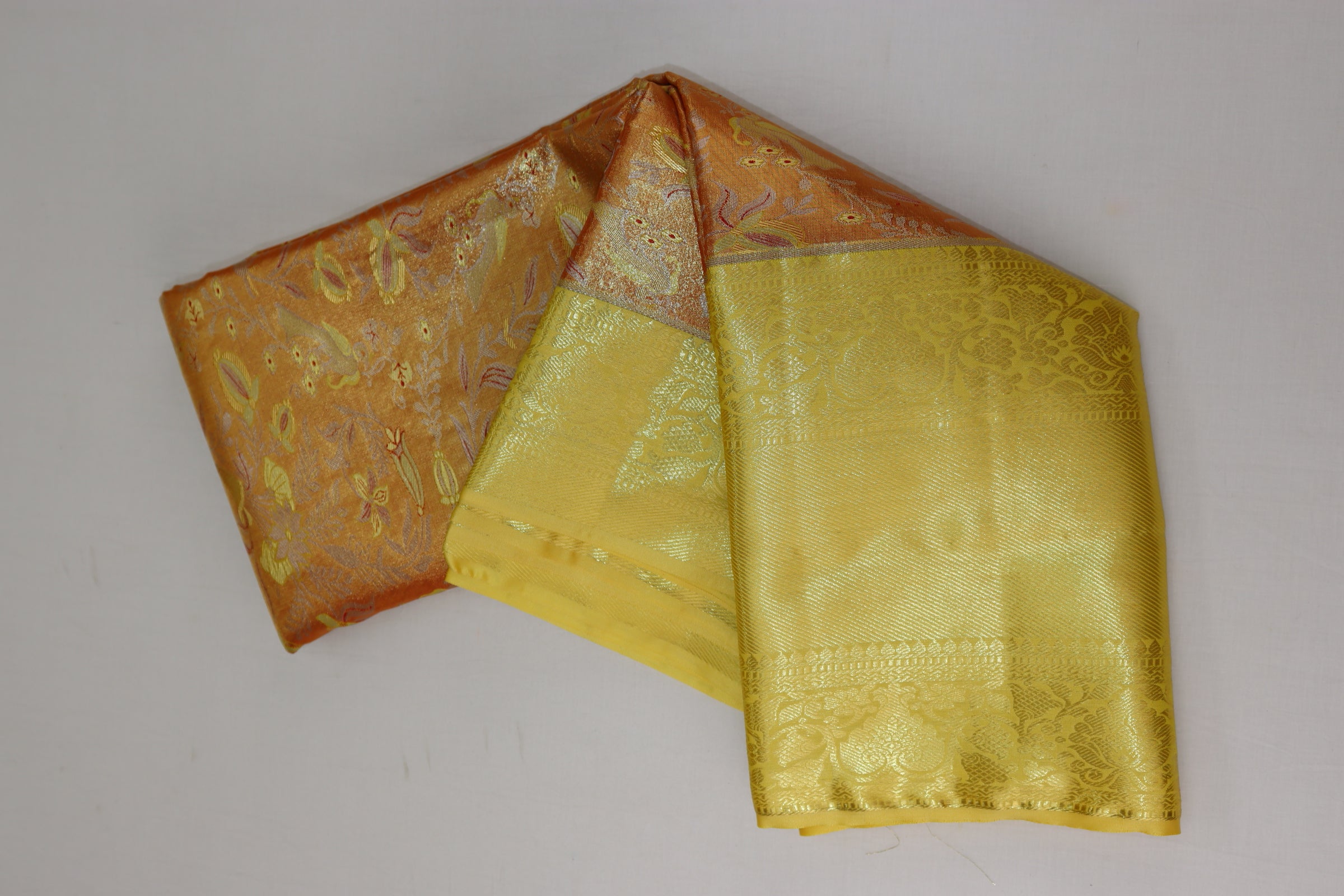 Elevate your style with our Rich Orange Kanjipuram Saree. Made with premium materials, this saree boasts elegance and comfort, perfect for any occasion. With an effortless drape and a matching blouse, experience the effortless grace and versatility of this timeless addition to your wardrobe.