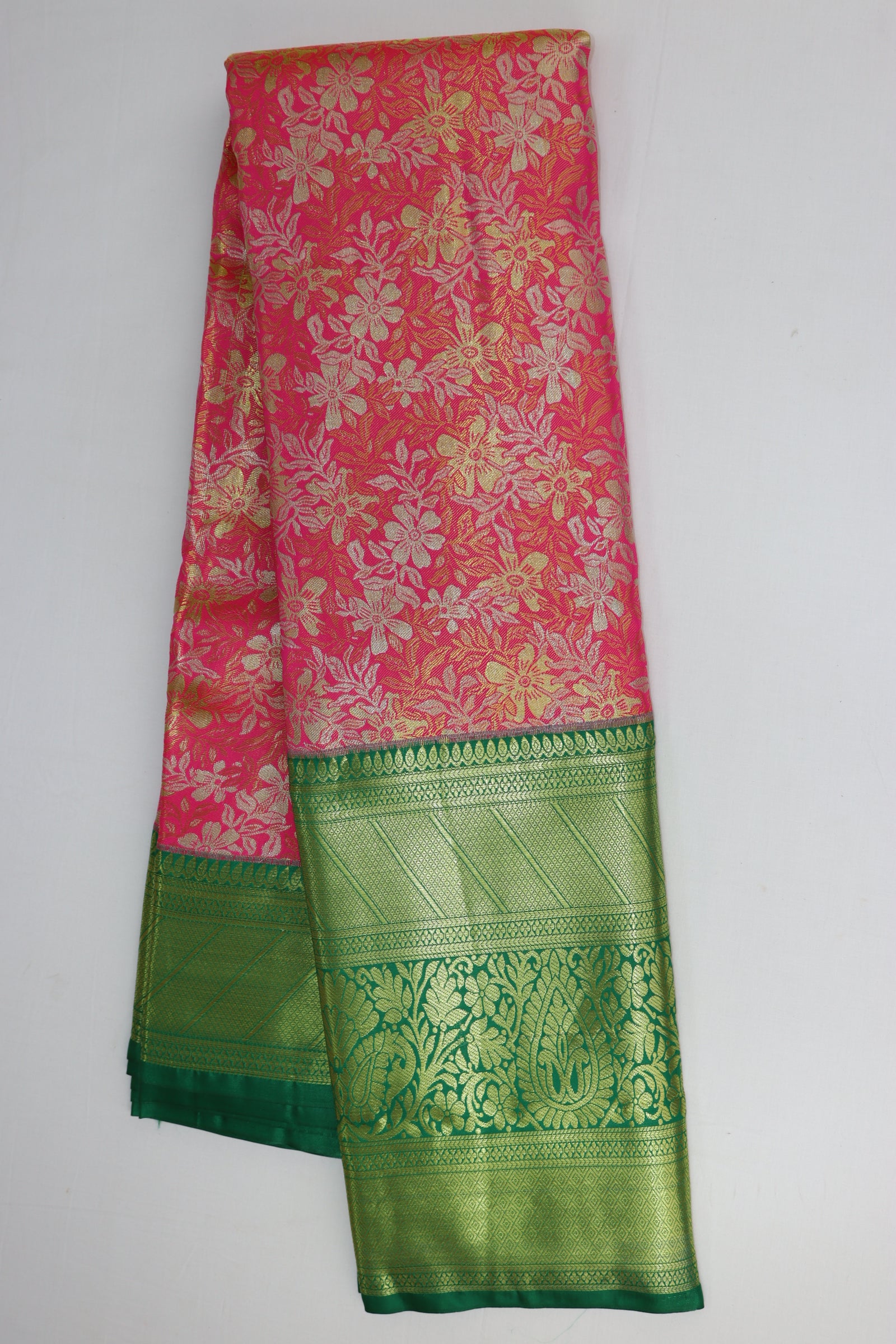 This Traditional Pink Kanjipuram Saree is expertly crafted with high-quality materials and intricate design. Made from the finest silk, this saree showcases the rich and vibrant culture of Kanjipuram. The traditional yellow color adds a touch of elegance and sophistication, making it a perfect choice for any special occasion.