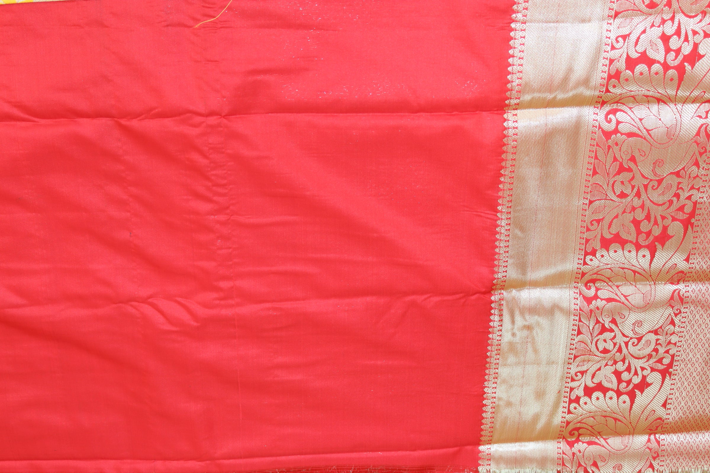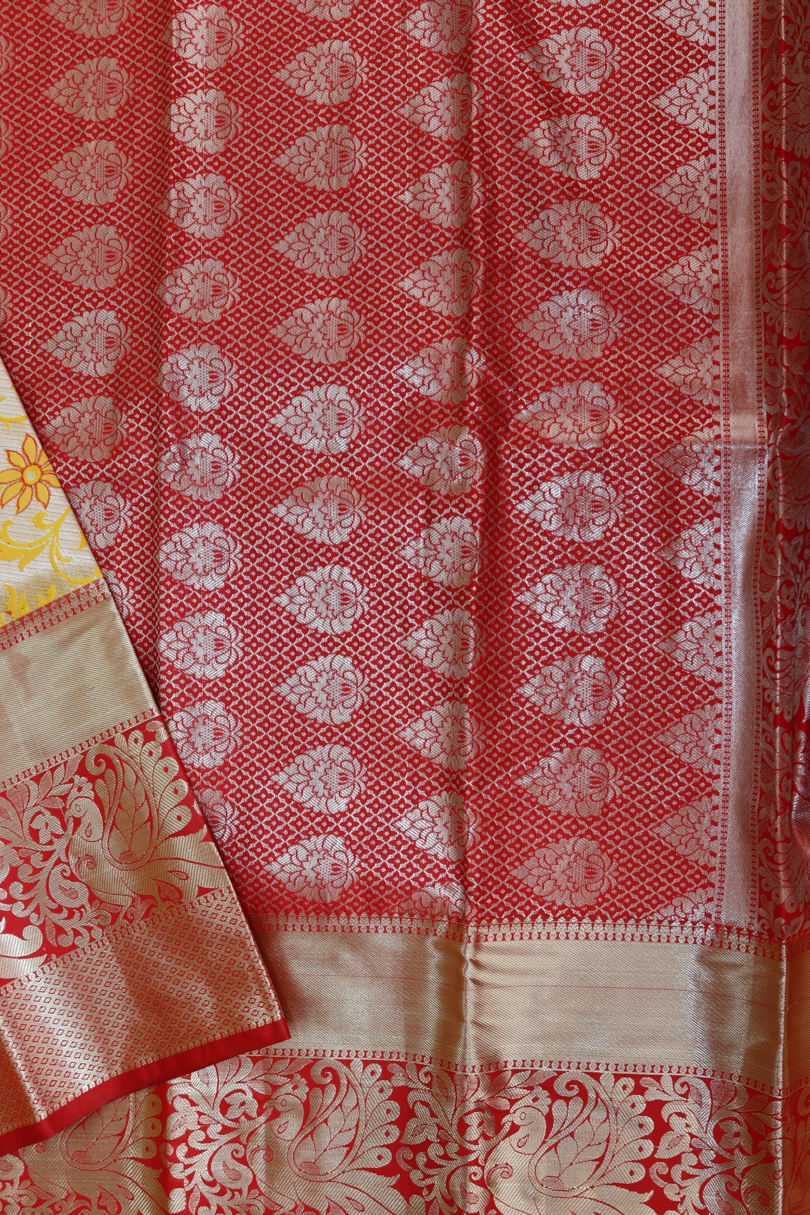 Experience timeless elegance with our Traditional Yellow Kanjipuram Saree. Impeccably crafted with high-quality materials, this saree exudes refinement and luxury. The rich yellow hue and intricate design make it a practical and sophisticated option for any event. Complement your outfit with the included matching blouse, creating a flawless and adaptable ensemble.