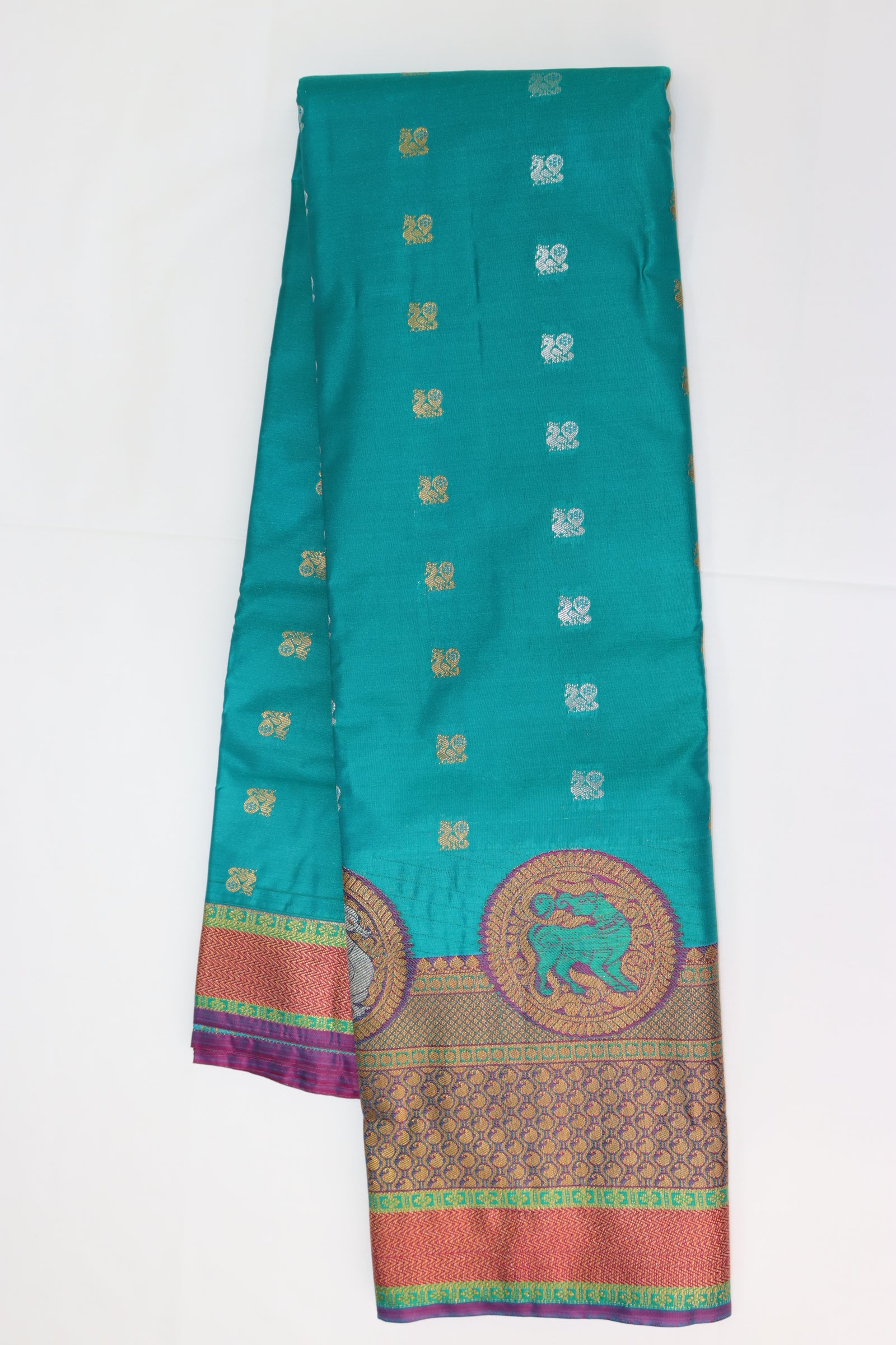 This handcrafted Trendy Blue Kanjipuram Saree is the epitome of elegance and comfort. Made with premium materials, it offers a weightless feel and luxurious touch. Perfect for any occasion, it comes with a blouse for added versatility. Upgrade your wardrobe with this Saree.