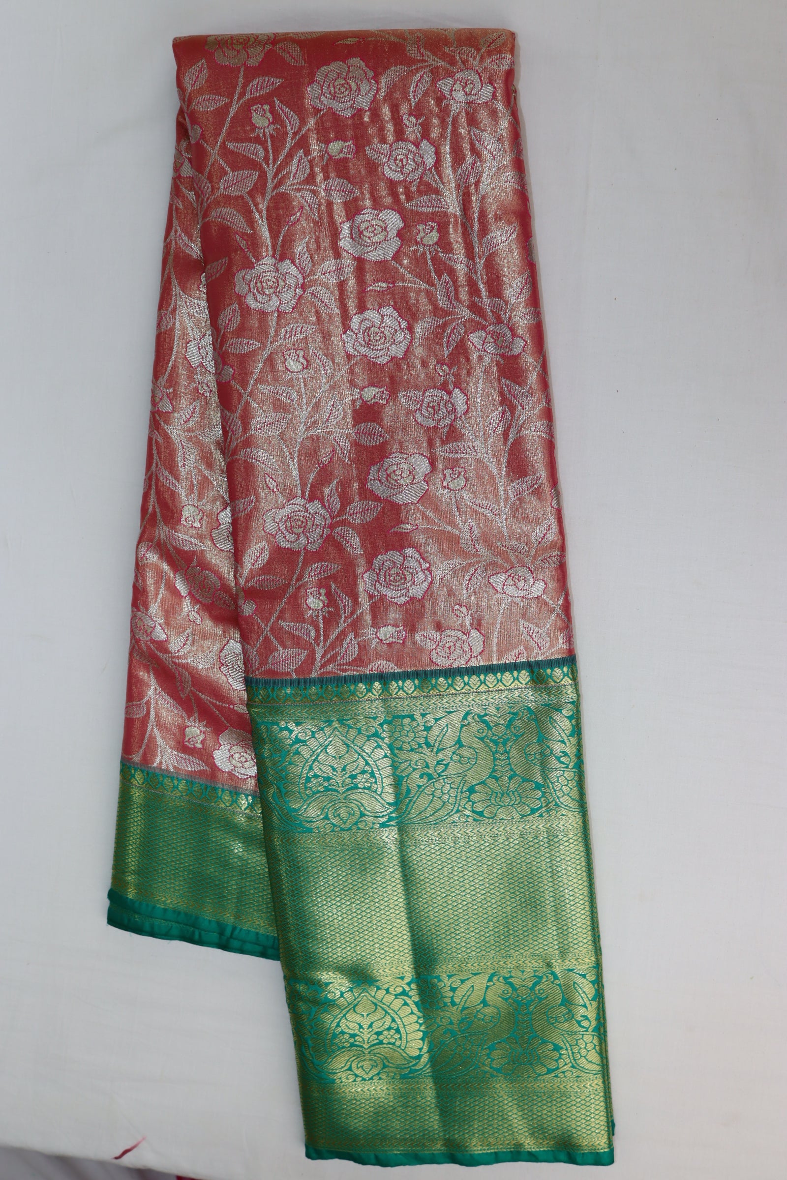 Trendy Coral Pink Tissue Kanjipuram Saree