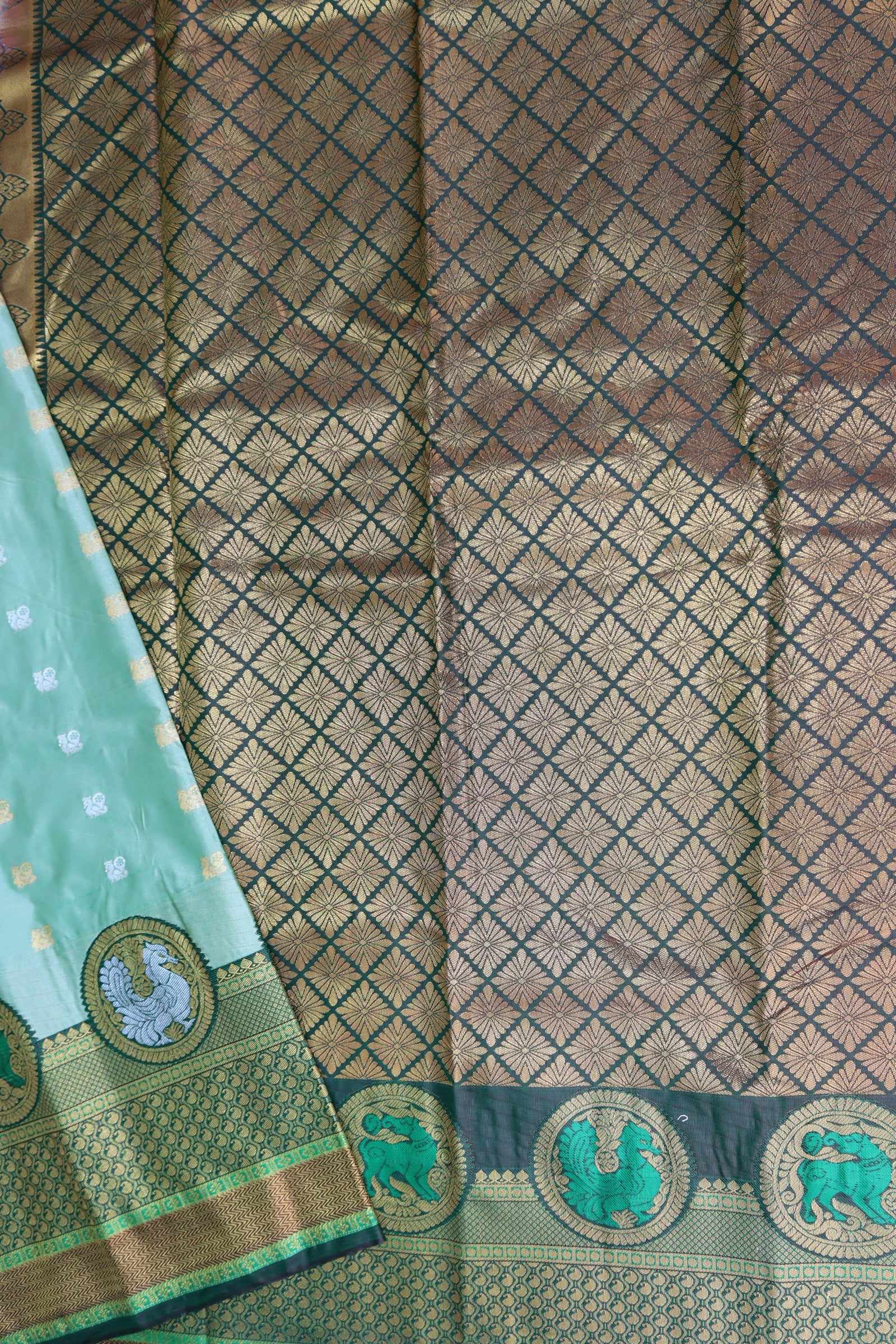 This handcrafted Trendy Green Kanjipuram Saree is the epitome of elegance and comfort. Made with premium materials, it offers a weightless feel and luxurious touch. Perfect for any occasion, it comes with a blouse for added versatility. Upgrade your wardrobe with this Saree.