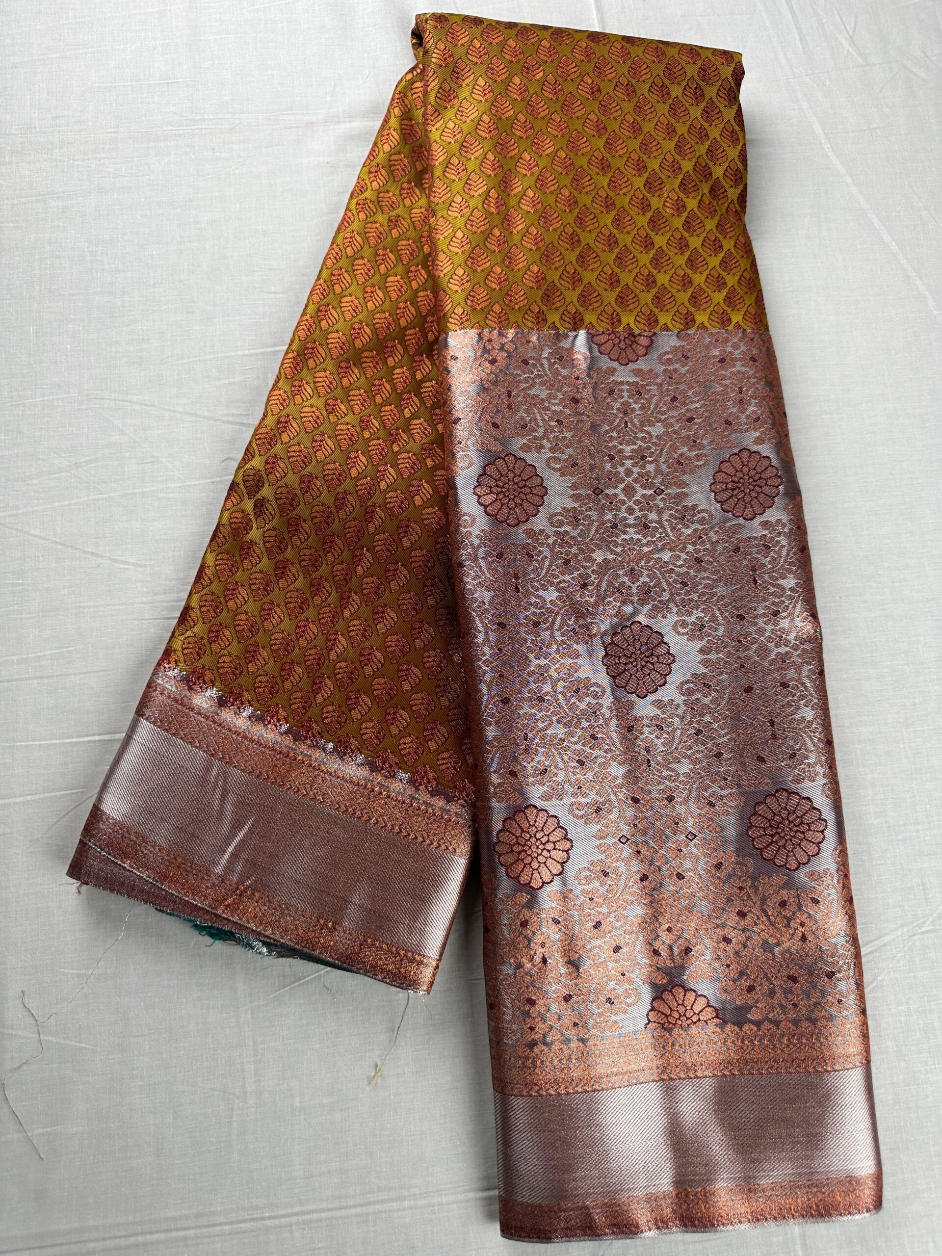 Make a statement and stand out at your next event in this stunning Trendy Rust Orange Kanjipuram Silk Saree! Featuring beautiful silk fabric and a Long Border, you’ll drape in elegance and style, showing ’em all you mean business. (But in a fun, fashionable way!)